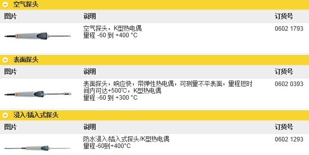 testo 830-T2紅外測溫儀的探頭選件: