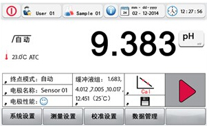 所有pH測量和校準相關的重要信息都清晰地顯示在4.3寸的彩色大液晶屏上。一次簡單觸摸即可進行測量、校準,或者在不同測量模式切換,隨機可見,如:電極狀態(tài)、當前緩沖液組等?珊唵我淮斡|摸,即進入對應的樣品名,用戶名,時間日期等的設置。